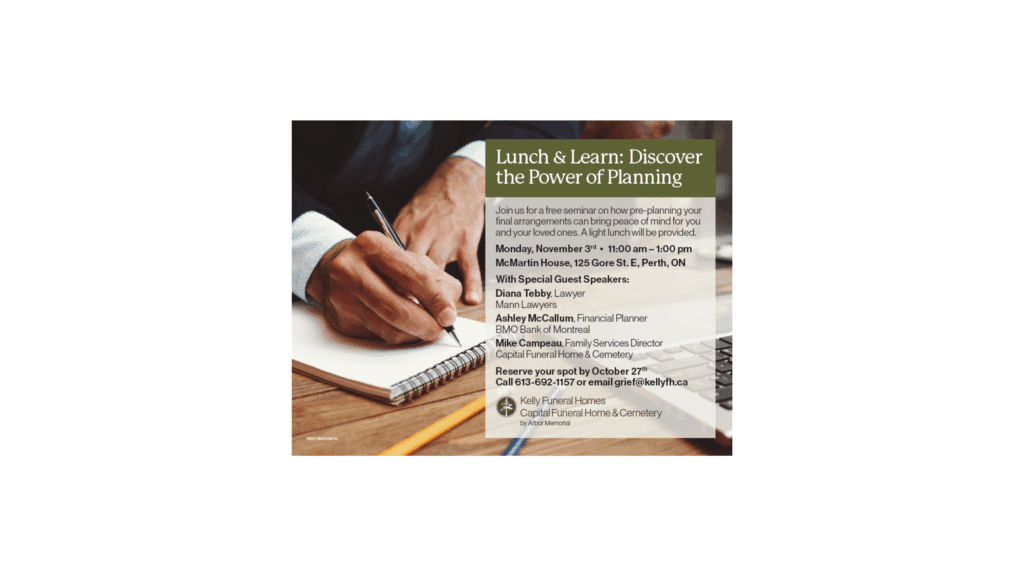 Join Kelly Funeral Homes in Perth for a free seminar on how pre-planning your final arrangements can bring peace of mind for you and your loved ones. A light lunch will be provided. Guest Speakers: Diana Tebby, Lawyer, Mann Lawyers Ashley McCallum, Financial Planner, BMO Bank of Montreal Mike Campeau, Family Services Director, Capital Funeral […]